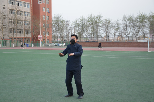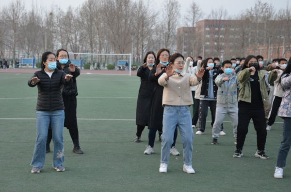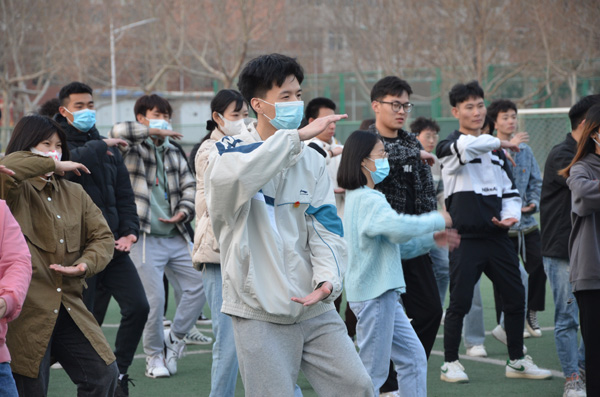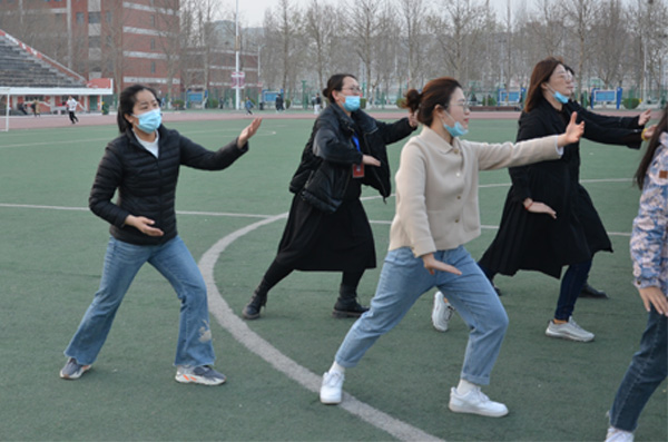 同学们按行列站好队,开始准备活动,学习太极拳二十四式中前三式——起势,左右野马分鬃,白鹤亮翅。