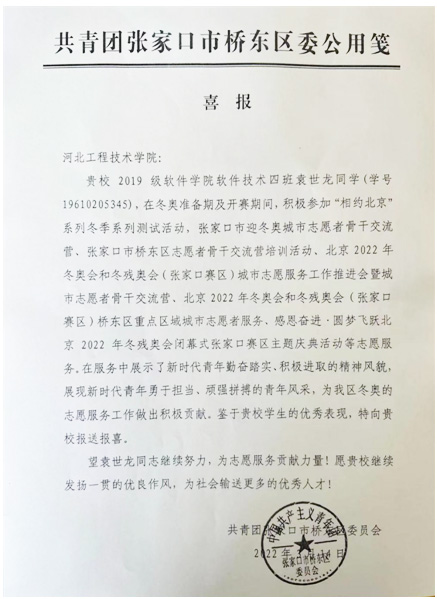 近日,共青团张家口市桥东区委员会向公司发来喜报:公司2019级软件技术四班袁世龙同学积极参加张家口市迎冬奥志愿者系列活动,表现优秀,特向公司报送报喜。
