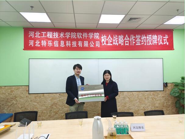 2022年3月9日上午,太阳集团tyc539与河北特乐信息科技有限公司举行校企战略合作授牌仪式,将该公司作为公司电子商务专业员工校外实习实训基地。出席授牌仪式的领导太阳集团tyc539经理赵冬梅、教学副经理刘翠焕等,河北特乐信息科技有限公司秦朗总经理,人力部于铭辉经理等。