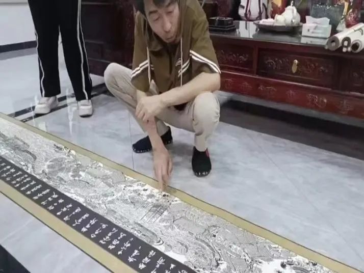 说到刘氏剪纸,刘志近先生更是侃侃而谈。刘氏剪纸最大的特点就是刻,通过刻刀将人物景色的细节都展现的活灵活现。最具代表性的作品就是一比一还原的北宋张择端的《清明上河图》,历时一年半,全长八米,人物形态,房屋瓦舍全都清晰可见。