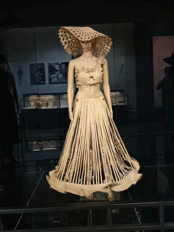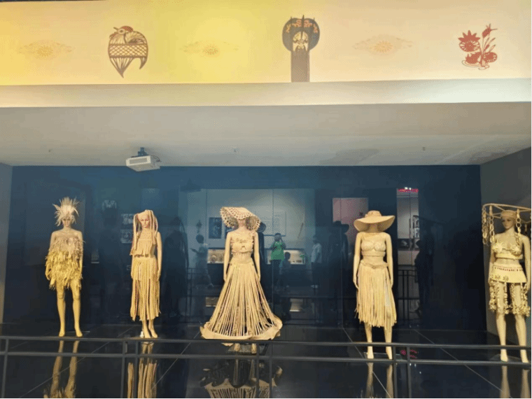 接着,团队成员参观了博物馆陈列的草编时装,五件服饰各有特点,每件服饰的款式都十分新颖、造型独特、别具一格,引起在场同学的纷纷赞叹。这些草编服饰表达出了人们内心对大自然的热爱和对美的追求,曾多次在大型活动中展览。第49个世界地球日来临之际,这些草编时装秀曾亮相北京花乡奥莱村;2010年5月14日,草编时装在世博园区内举行了时装秀,倡导低碳环保的草编时装吸引了众多参观者的目光。改革开放后,草编工艺师在传统工艺的基础上结合现代先进技术,现已开发产品千余种,特别是草编服饰系列产品为各界人士所珍藏,深受时装模特和专家青睐。不仅如此,这些草编时装更是远销欧、亚、美等十几个国家和地区。草编,农耕时期传承下来的朴素的民间技艺,经过一代代传承者的努力,得到了升华。