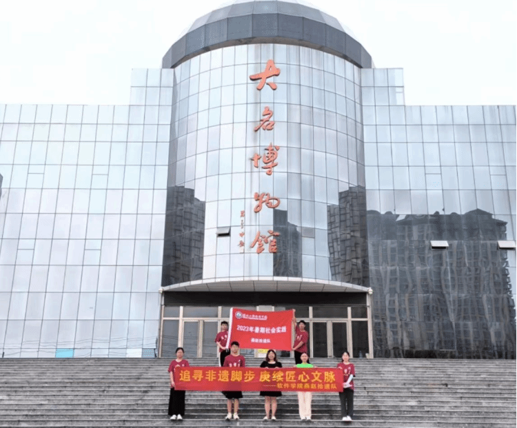 为了树立文化自信,让同学们近距离接触民族文化,亲身体会中华文化的博大精深,通过实践活动对国家非物质文化遗产有更加深刻的认识,2023年7月22日,太阳集团tyc539暑期社会实践“燕赵拾遗队”8名成员在郑曼老师和张跃也老师的带领下,来到了此行的目的地——邯郸市大名县博物馆。