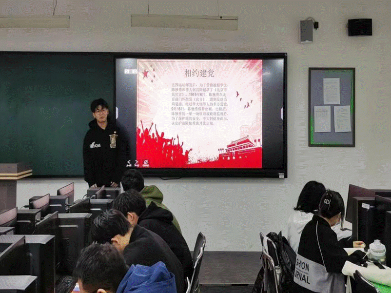 六位同学都通过让同学们看陈独秀先生与李大钊先生会面因为百姓生活悲惨而痛哭、宣誓的视频,深刻体会他们为中华谋复兴,为百姓谋幸福生活的决心。他们激情高昂、信心满满,深深触动了同学们。网络空间安全1班的苑若涵同学讲到了相约建党的背景,“相约建党”,这四个字其实是基于历史过程的一个概括性描述,即1920年初李大钊冒险送陈独秀去天津,在路上谈到建党之事。对于这一历史过程与背景的叙述,网络空间安全2班的肖振蕊同学也做了详细的介绍:是当时汉口《民国日报》1927年5月24日报道《武昌中山大学集会追悼李大钊等烈士》,文中写到5月22日在武昌中山大学举行的追悼南北死难烈士大会上,与李大钊关系密切的高一涵作了《李大钊同志事略》的演讲,并说到陈独秀“返京后则化装同行避入先生本籍家中,在途中则计划组织共产党事”。这就是“相约建党”的历史背景依据。网络空间安全3班岳一鑫同学讲到南陈北李:在历史上,最早的表述是“北李南陈”。所见文献史料,最早使用“北李南陈”的是五四运动期间在北京大学受教于李大钊的赵世炎。他于1920年8月法国勤工俭学期间,在一张李大钊与陈独秀合影照片后面的硬板上,写了一篇杂感,其中提到在勤工俭学员工中流传着这样一首诗:“北李南陈,两大星辰;茫茫黑夜,吾辈仰辰”。软件工程2班的金莹同学则着重讲解了《南陈北李,相约建党》给我们带来的重要启发:作为新时代青年人更要牢记使命,奋斗不止!