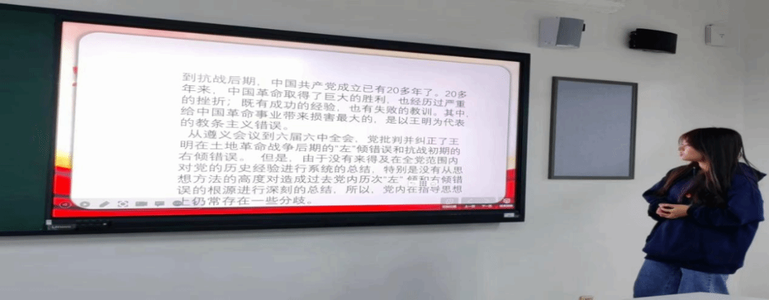 22级网络空间安全三班的曹思瑜同学则按照时间线介绍了毛主席做出的贡献:2月1日,毛泽东在中央党校开学典礼作了《整顿学风党风文风》的报告,提出“反对主观主义以整顿学风,反对宗派主义以整顿党风,反对党八股以整顿文风,这就是我们的任务。”2月8日,毛泽东在延安干部会上作《反对党八股》的报告,明确指出党八股是主观主义和宗派主义的一种表现形式,并列举了党八股的八大罪状,把文风提到了党风的高度,使人耳目一新。软件工程一班的严少东同学介绍了进行延安整风的任务:反对主观主义。软件工程二班的李佳鑫同学则讲解了延安整风的历史意义。