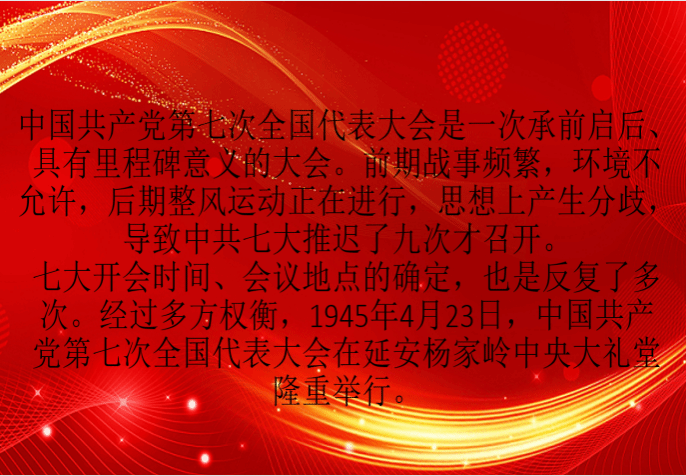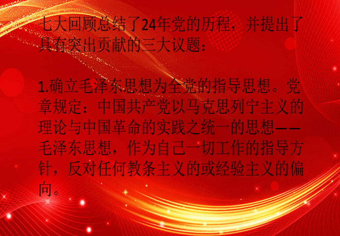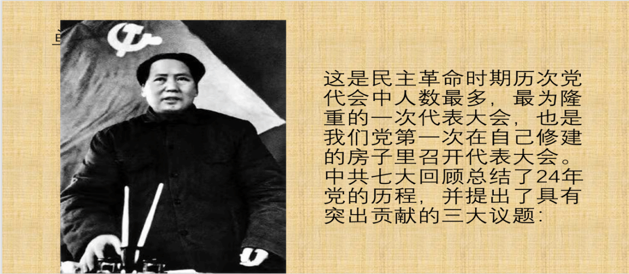 22软件工程二班的张友剑同学介绍了中共七大的会址:4月23日,在延安杨家岭中央大礼堂,七大开幕式的主席台上,悬挂着毛泽东和朱德的巨幅画像,鲜艳的党旗挂在两边。会场后面的墙上,挂着“同心同德”四个大字。两侧墙上张贴着“坚持真理”“修正错误”等标语,靠墙边插着24面红旗,象征着中国共产党24年奋斗的历程。插红旗的“V”字形木座是革命胜利的标志。在主席台的正上方,悬挂着一条引人注目的横幅:“在毛泽东的旗帜下胜利前进!”