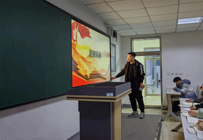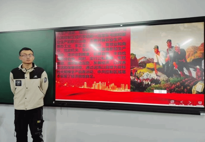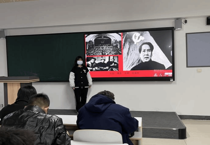 22软件工程三班的耿子豪同学向同学们介绍了毛主席的发言:在中国人民面前摆着两条道路,光明的路和黑暗的路;有两种中国之命运,光明的中国之命运和黑暗的中国之命运。我们的任务不是别的,就是放手发动群众,壮大人民力量,团结全国一切可以团结的力量,在我们党领导之下,为着打败日本侵略者,建设一个光明的新中国,建设一个独立的、自由的、民主的、统一的、富强的新中国而奋斗。我们应当用全力去争取光明的前途和光明的命运。