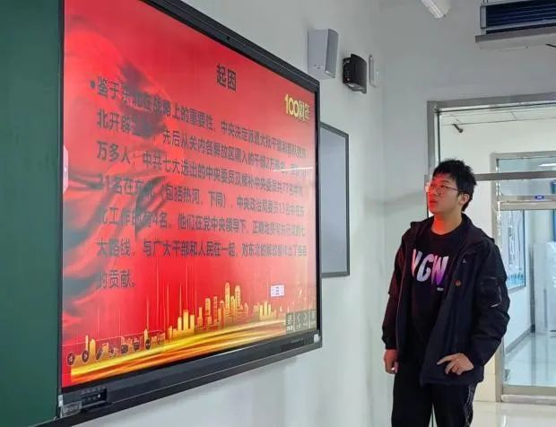 2022级网络空间安全一班的陈亚欧同学给大家介绍了“向北发展,向南预防”方针的提出:面对蒋介石的大举进攻,中国共产党加紧自卫战争的准备,但相对弱小的人民武装一时还无法从根本上战胜敌人,为了保存和发展自己,中共中央的战略部署作了重大改变,提出“向南防御、向北发展”的方针。