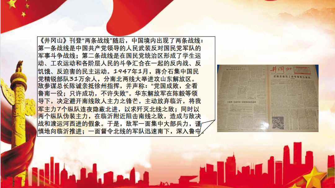 1946年6月26日,国民党不顾全国人民的强烈反对,以围攻中原解放区为起点,相继向解放区展开大规模的进攻,全面内战爆发。基于当时的境况,以毛泽东为首的中共中央决定,放弃某些地区,使敌军背上包袱,分散兵力,以换得在局部地点集中优势兵力,各个歼灭敌人。此时,在中国境内,除了由中国共产党领导人民武装反对国民党军队军事斗争的第一条战线外,在国民党统治区还形成了第二条战线,即由员工运动、工农运动和各阶层人民的斗争汇合在一起的反内战、反饥饿、反迫害的民主运动。为使同学们更加深刻地了解到两条战线的艰辛历程,特进行四史教育第四十讲——两条战线,内外夹攻。