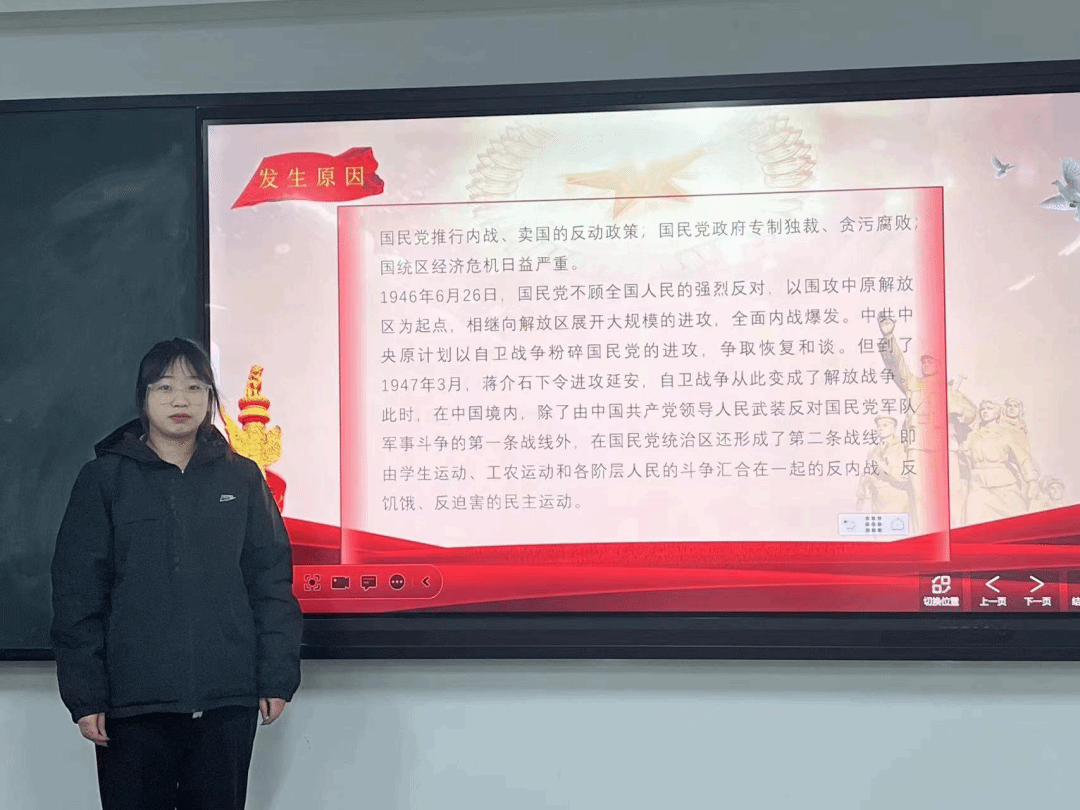 2022级软件工程一班的朱奥旭向同学们讲解了第二条战线的建立,证明广大工人、农民、市民、小资产阶级、民族资产阶级、开明绅士、爱国华侨和各民主党派、人民团体等,都逐步站到了中国共产党一边,有力配合了人民解放军军事战场的斗争,对推翻国民党反动统治、解放全中国发挥了重要作用。