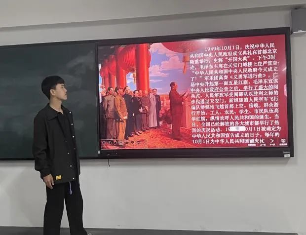 2022级软件工程三班的祝帅同学主要介绍了开国大典的游行:随着阅兵式的结束。此时天色已晚,长安街华灯齐放,群众游行开始了。一队队游行群众高举红旗和红灯,纵情欢呼,“中华人民共和国万岁!”“毛主席万岁!”的口号声响彻云霄。天安门城楼上,毛主席探身栏杆外,不停地向广场上的群众挥手致意,情不自禁地在扩音机前大声高呼:“同志们万岁!”广场上,人们热情洋溢,载歌载舞,万众欢腾,尽情地欢度新中国的第一个夜晚,节日的首都沉浸在幸福、喜悦和欢欣鼓舞中。这一天,在全国已经解放的各大城市,都举行了隆重热烈的庆祝活动。