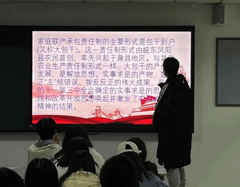 22级软件工程4班的史亚辉同学为同学们说明了在1982年党中央以一号文件形式批转的《全国农村工作会议纪要》中明确指出,“目前实行的各种责任制,包括小段包工定额计酬,专业承包联产计酬,联产到劳,包产到户、到组,包干到户、到组等等,都是社会主义集体经济的生产责任制。”大包干打破了“大锅饭”,把农民的责、权、利紧密结合起来,做到了有统有分、统分结合,极大解放了束缚的生产力,我国农村开始向着专业化、商品化、社会化生产转变。