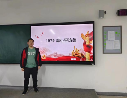 2022级电子商务1班的王赫同学讲到邓小平访美的历史背景:新中国领导人对美国的“破冰之旅”,如巨人之手推开封闭的国门,一个重现生机的文明古国,正开始探索与世界互利共赢之路。1979年1月1日,随着中美两国发布联合公报,至此中美两国几十年针锋相对,没有外交往来的日子就此成为历史。1月28日,在美国总统的邀 请下邓小平开启访美之旅,中美两国的关系就此被推向高峰。