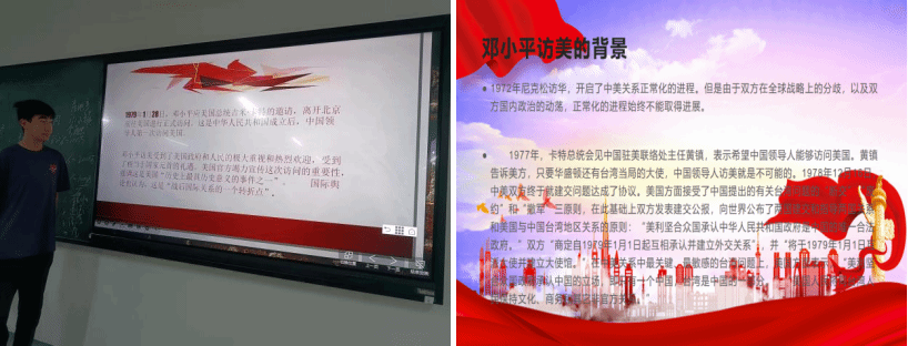 几位同学在演讲前做了充足准备,在教室、宿舍等利用手机和电脑浏览和查阅相关资料,站在讲台上侃侃而谈,为同学们生动讲解那年邓小平先生访问美国的故事。