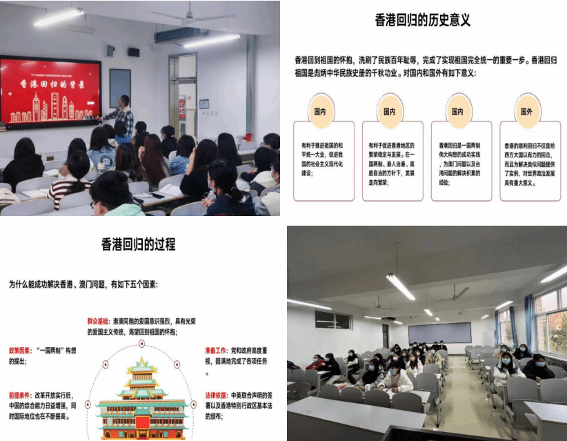 2022级电子商务一班的刘小诗同学首先为同学们讲述了1997年7月1日零点整,国歌奏响,五星红旗徐徐升起,香港正式回归祖国的怀抱。零时4分庄严宣告“中华人民共和国香港特别行政区正式成立。”回顾香港,澳门问题的成功解决离不开如下五个因素:前提条件,有力的政策,坚实的群众基础,前期的准备工作以及法律依据。