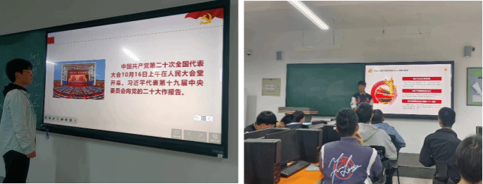 今天我们四史教育专题活动为第一百讲“党的二十大”,同学们通过电子设备查询、图书馆翻阅相关资料,为大家展开了关于“二十大”的主题演讲。
