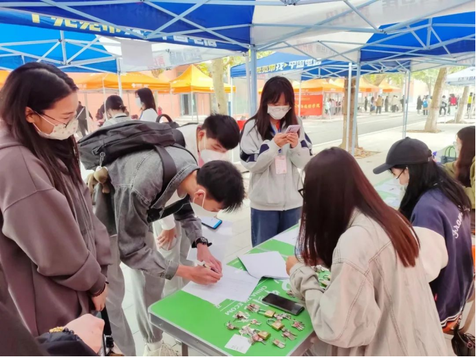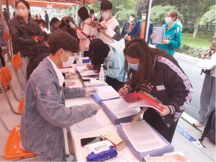 穿过了繁华的街道,学长学姐引领新生前往报到处报名,大家都有礼貌并且很有秩序的排队,听着指挥进行报名填写资料,进行登记,分宿舍领取钥匙。