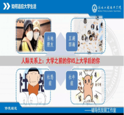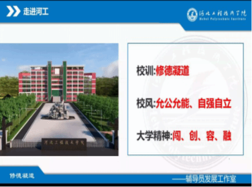辅导员首先进行了详细的自我介绍,使同学们对辅导员有一个初印象。本次主题班会围绕“走进河工”“适应老员工活”“奋斗河工”三个模块开展。在走进河工的开始,辅导员先通过视频以及讲解让同学们了解了河工的校训、校风、大学精神,增强了同学们的知校爱校荣校意识。接着通过大学前生活和大学后生活的对比,使同学们了解到高中和大学在学习方式、人际交往等方面的不同之处。