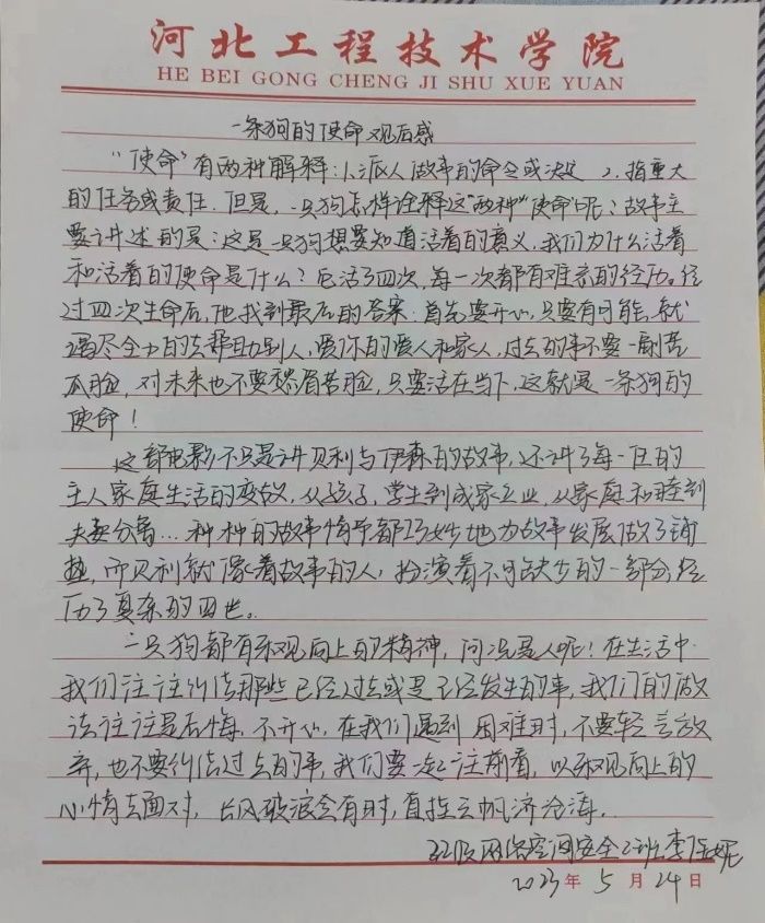此次主题活动观看的影片是《一条狗的使命2》,该片讲述了小狗贝利延续使命,在主人伊森的嘱托下,通过不断的生命轮回, 执着守护伊森的孙女CJ,将伊森对孙女的爱与陪伴,当做最重要的使命和意义,最终帮助CJ收获幸福,再次回到主人伊森身边的故事。小狗在不断的生命轮回里追寻自我,尽心尽职地完成着自己每一世的使命。最终得出了“活在当下”的人生感悟:“一定要开心,只要有可能,就竭尽全力帮助他人”。