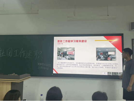本次述职共有十个社团,三十五个班级团支部参与。考察维度分别从班子建设、团员管理、活动开展、制度落实和作用发挥五个方面十二个小项进行考察,总分为100分。各位参评人采用PPT讲解的方式向评委们阐述了各团支部基本情况,活动开展具体情况,团支部书记述学,未来的工作计划,并在最后进行了工作总结与自身不足之处的反思,争取使每个班团支部和社团的发展更上一层楼。