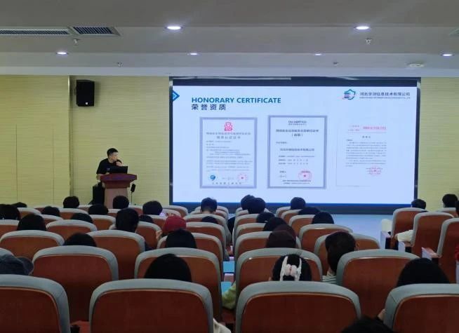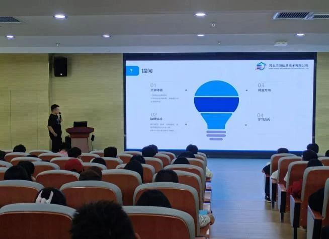 孔总监首先对河北华测信息技术有限公司进行了简单介绍,让同学们对该公司有了基本了解,又介绍了该公司所获相关证书以及相关奖项。接着对之前在参观公司时同学们所提到的工资待遇,加班情况,就业方向,及学习方向这四个主要问题进行统一回答。