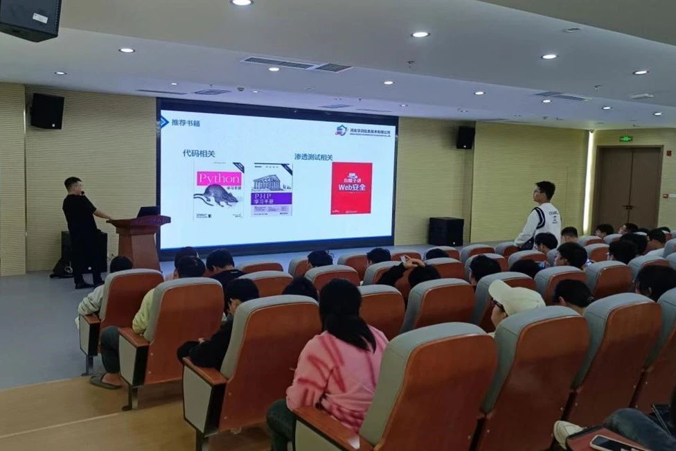 孔总监讲到网络空间安全专业来讲就业职位主要是做渗透测试工程师和安全研究人员,同时对工作后上班时间与该行业的人员分类,相关平台,及其奖励机制进行说明,之后主要围绕渗透测试进行了说明。在提问环节,同学们积极响应纷纷举手提问,孔总监也一一详细回答并提出相关建议。