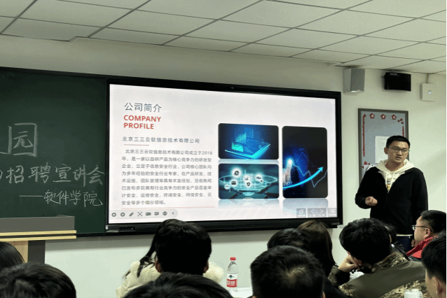 北京三三云软信息技术有限公司成立于2018年,是一家以自研产品为核心竞争力覆盖审计安全、运维安全、终端安全、网络安全、云安全等多个细分领域的研发型企业,其核心业务为安全产品、安全服务、人工智能、物联网。企业应试岗位为前端开发工程师、JAVA开发工程师、C/C++开发工程师、质量保障工程师、技术支持安扶工程师、机器学习算法工程师等若干。企业负责人从学业侧重、社会需求、技术应用、薪酬福利、办公环境、实践活动等方面展开详细的企业宣讲介绍,使软件学子们瞄准从业目标靶向靠拢。