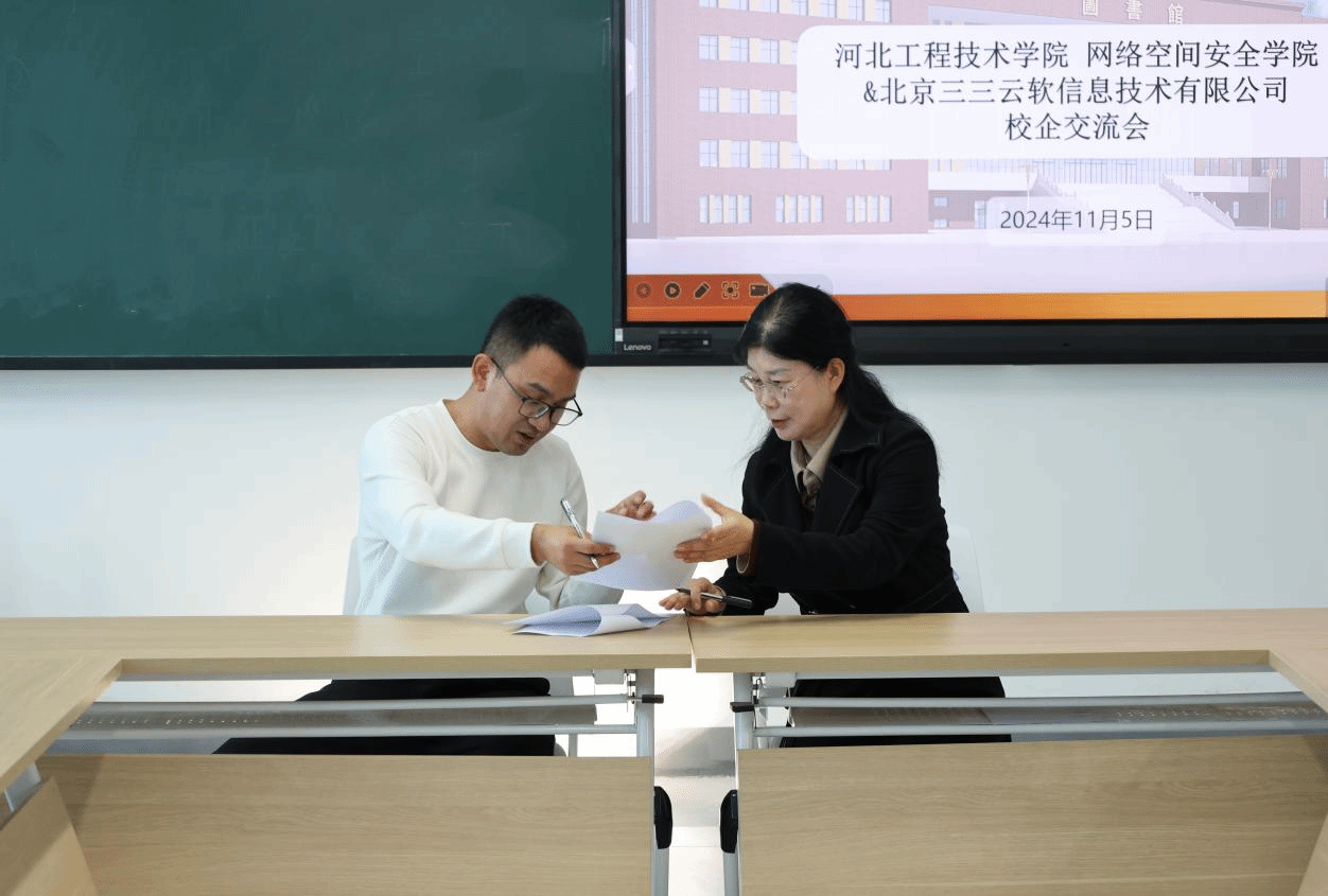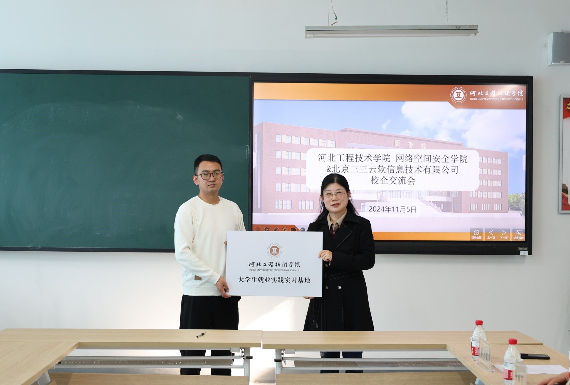 2024年11月5日,太阳集团tyc539网络空间安全公司与北京三三云软信息技术有限公司校企交流会在次教304正式举行。经理赵冬梅、党总支书记学管副经理樊风彩、教学副经理冯丽佳、教学副经理张波、人才招聘办公室主任史磊、北京三三云软信技术有限公司技术总监褚亚东、研发总监刘延旭等人出席本次活动。