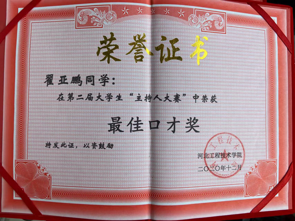 在学习之余,翟亚鹏喜欢参加各类文体活动。他在校运动会上多次取得优异成绩,在大一军训期间获得“军训优秀个人”奖,在“金话筒,寻觅河工佳音”主持人大赛中获得最佳上镜奖。