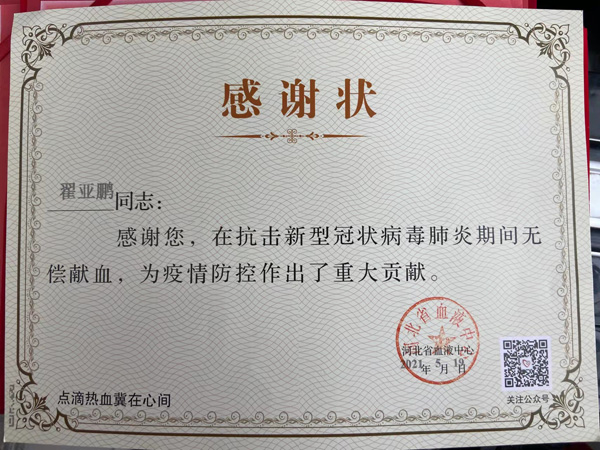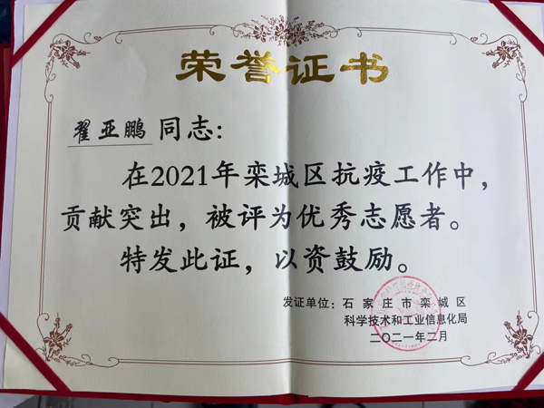 他同时也在关注疫情,投身到抗疫工作中,做力所能及的事,贡献突出,被评为优秀志愿者。