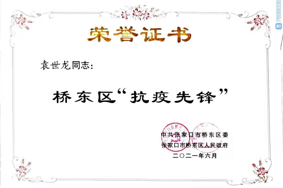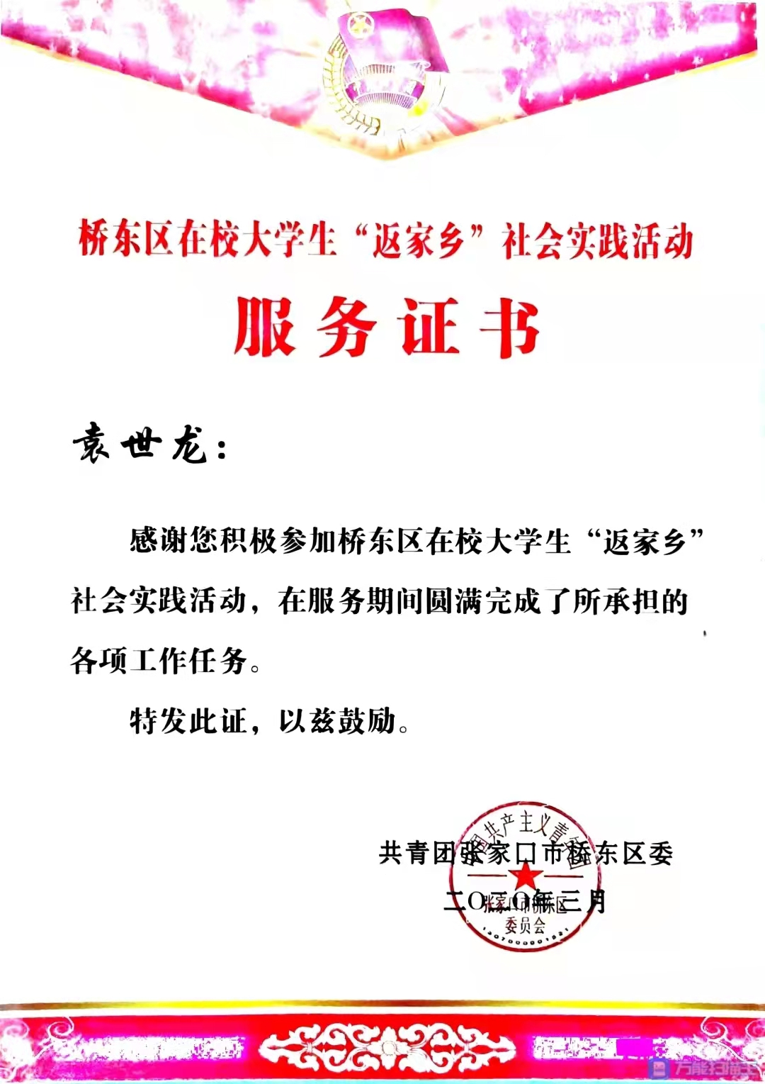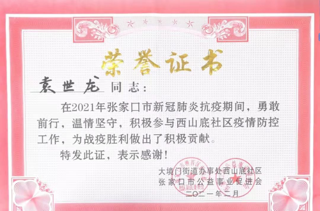 他在2019年参加张家口市桥东区“返家乡”社会实践活动,“周末做贡献 创城我先行”志愿服务活动启动仪式;2020年参加抗击新冠肺炎志愿服务活动,利用专业所学技能,创新性的协助社区开发制作了小区出入登记系统,受到了街道党工委的表彰;2021年继续参加社区各类志愿服务活动,协助数据汇总、入户排查、疫苗接种等系列志愿服务工作,被区委、区政府评为“抗疫先锋”个人称号。