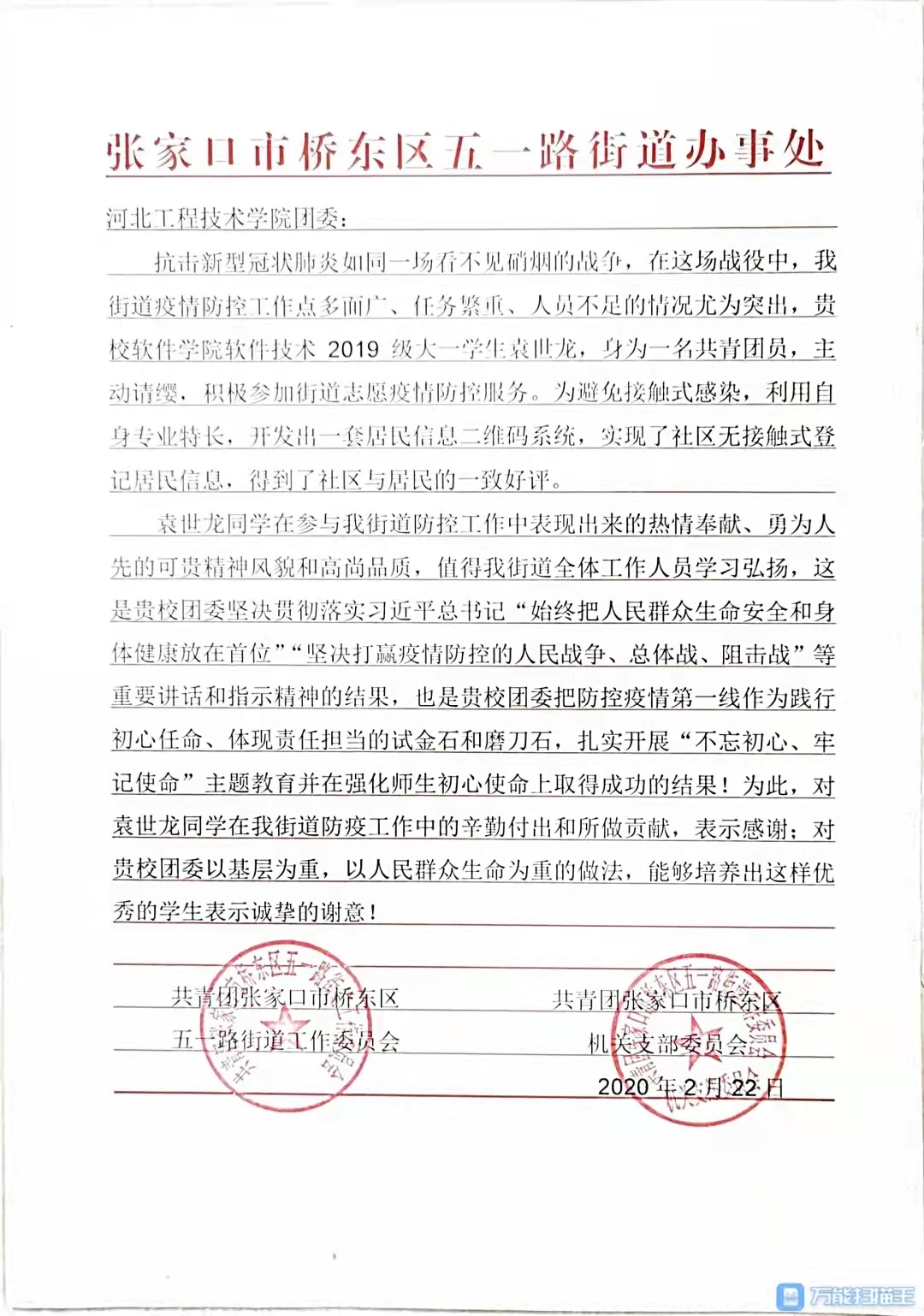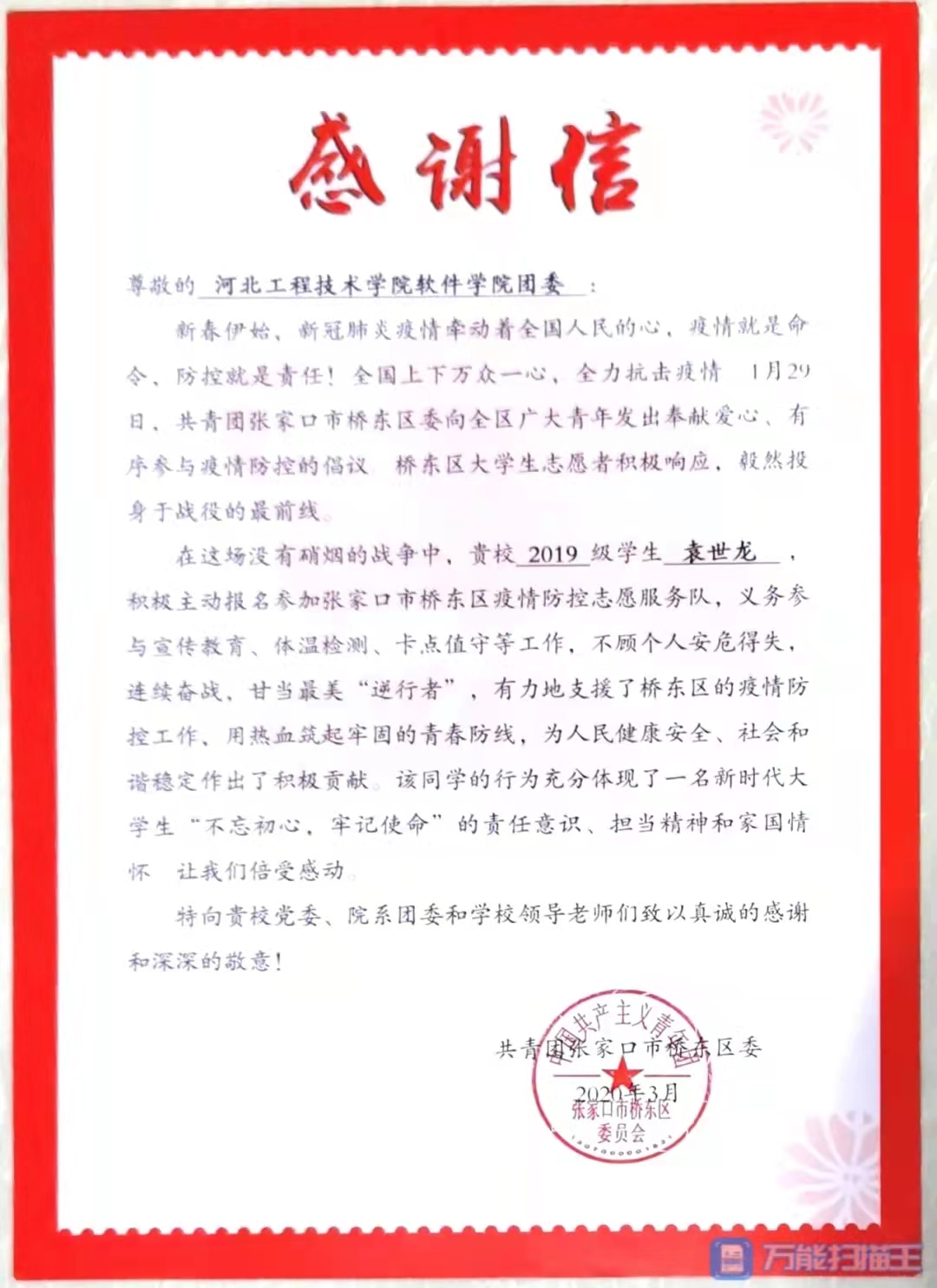 袁世龙,男,太阳集团tyc5392019级软件技术专业员工。在校期间认真学习,积极参加公司组织的各类活动。在假期主动参加志愿服务活动,受到当地团委的表扬,并提供了共青团张家口市桥东区委工作岗位。
