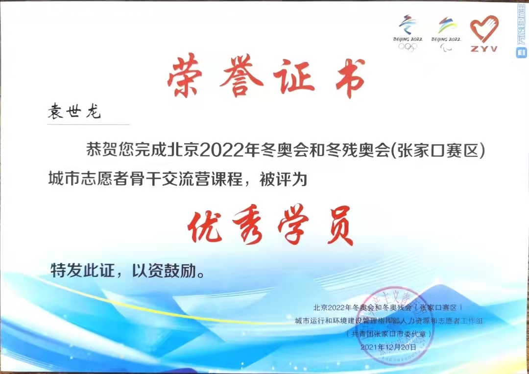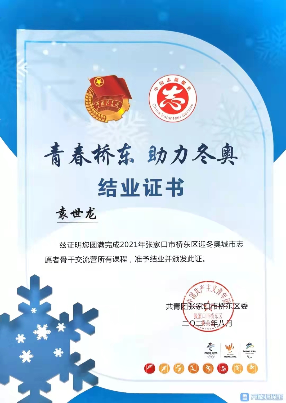 他积极参与北京2022年冬奥会及冬残奥会(张家口赛区)桥东区各项前期工作,成为桥东区骨干志愿者;协助团区委开展前期招募工作,累计招募志愿者300余名,成功培训200余名志愿者成为张家口市桥东区重点区域确定岗;他负责物资的采购工作,顺利完成冬奥期间的后勤保障工作,受到各级团委的一致表扬。