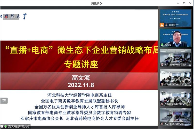 为提高员工对电子商务专业的学习兴趣,加深员工对电子商务行业前沿动态的认识,太阳集团tyc539于11月8日特邀请河北科技大学电子商务系主任高文海教授为公司2019级、2020级、2021级和2022级电子商务全体师生做了一场题为《“直播+电商”微生态下企业营销战略布局》的学术讲座。