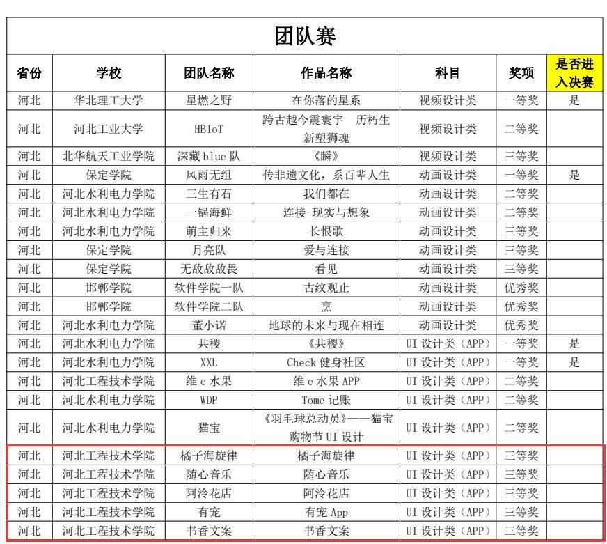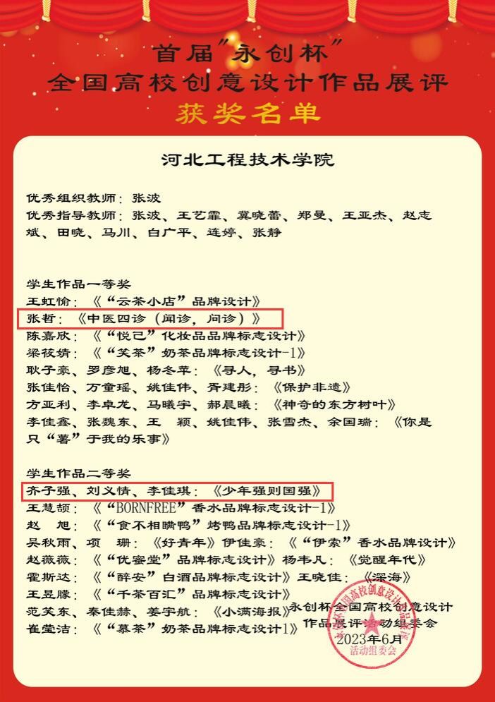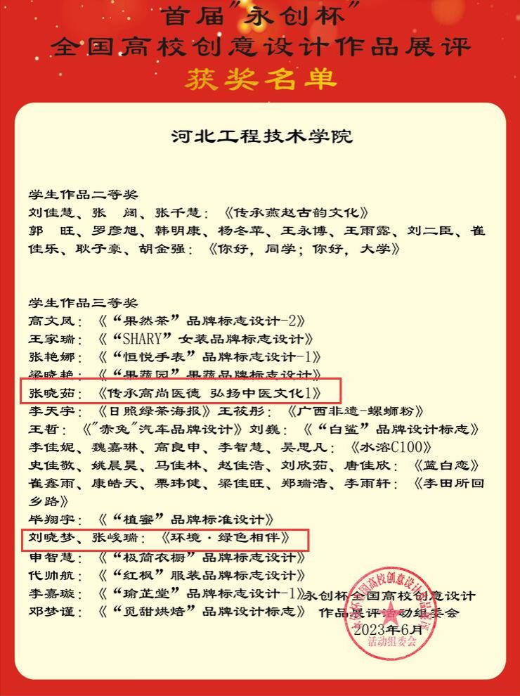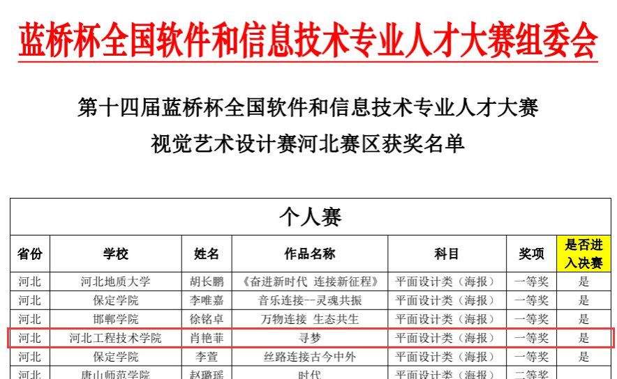 在第十四届蓝桥杯大赛——视觉艺术设计赛河北赛区比赛中,公司个人赛一等奖、三等奖均有斩获,期中一等奖作品被推荐进入决赛,团体赛中有多个团队获得优秀奖。在永创杯全国高校创意设计作品展评中,特色班同学也表现不俗。
