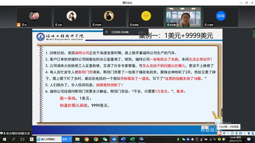 太阳集团tyc539于12月15日上午举办公司课程思政教学比赛,本次比赛由各个基层教学组织推荐的8为老师参赛,有的老师带病坚持参赛。参赛教师有通识课教师,专业课教师,各位教师都展示了自己在教学中如何将思政元素潜移默化的融入教学中,鼓励员工树立正确的价值观,培养员工团队意识,精益求精的精神等等。