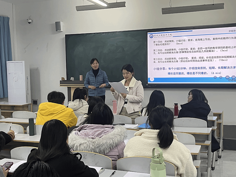 本次教研活动的第二部内容是学习“高校教师教学伦理原则”,李小敏老师用BOPPPS教学模式进行讲解,培训过程中重点突出分组讨论的教学方法,公司教师共分为10组,每个小组由5-7名老师组成。软件工程系主任冯丽佳、网络空间安全系主任尹益燕及空间信息与数字技术系主任韩冰三位老师同时参与了分组讨论学习过程的指导。整个培训过程,老师们积极投入、氛围热烈,老师们以员工的身份体会了BOPPPS教学模型的课堂设计与实施,小组展示环节将本次活动推向高潮。